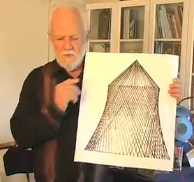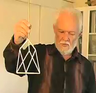 The next model (above, right) of the heptahedron, which he has named the “chestahedron,” shows edges only. Mr. Chester did all kinds of things with his model to discover wherever it might lead him. He was curious about the sacred geometry relationships; in particular, how platonic forms fit inside each other. He found that the heptahedron fits inside a cube with its axis at 36 degrees.