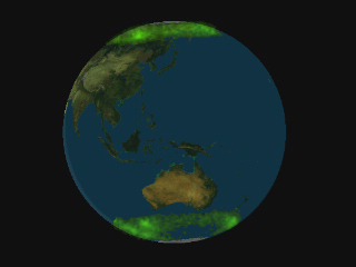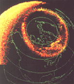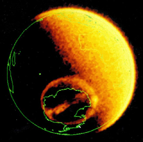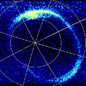 It turns out that a matching ring is also visible on the surface of the Earth. The next two photos, above right, show the north pole (in the blue photo, at the axis) with the Northern Lights showing. The two white rings are drawn to show the pattern revealed to scientists, as yet not explained. Photographic evidence from satellites have shown that the Aurora Borealis displays light within the confines of that ring. The Northern Lights show up anywhere within the ring, and do not cross or flash into center circle. The circle immediately surrounding the North Pole stays dark, while the Borealis flare up most boldly all around. But look at this picture (below left) of the Aurora Australis, the lights over Antarctica. The light streams across at the South Pole, in the center area too. There is an explanation, using the seven sided form, as to why the Southern Lights show up differently than the Northern.