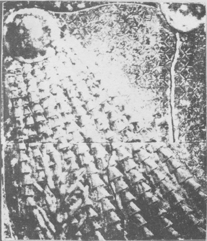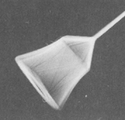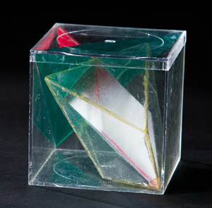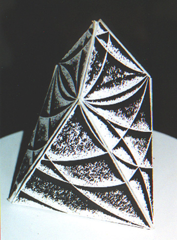 Mr. Chester wanted to take this two-dimensional seven-sided image and make it three-dimensional. He thought about what it would be as a platonic form. Not satisfied by the existing models for what a seven- sided form would look like, he tinkered with clay and string and straws and wire and paper and bubbles and whatever models he could make, until he discovered a shape more simple and elegant than any presented before. The implications of his discovery of this heptahedron affect notions in mathematics, geology, architecture, medicine, and more; much more than is touched upon by this article. This shape has seven sides: each side has exactly the same surface area. There are four equal triangles and three equal four-sided shapes that look like kites. In the picture (below left) of his cardboard model, you see one of the triangles, and two of the kite-shaped sides. Mr. Chester has found that he can draw all the surfaces of this shape, flattened, by using two sizes of circles; the arc tracings on the sides of this model show the remnants of that drawing process. The relationship between the size of the two circles is the Golden Mean, a ratio that artists and scientists have found governs many natural items such as the proportions of a leaf or of the human body.